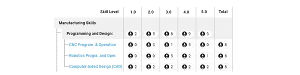 Aggregate headcount based on skill level to identify capacity hotspots and risks.